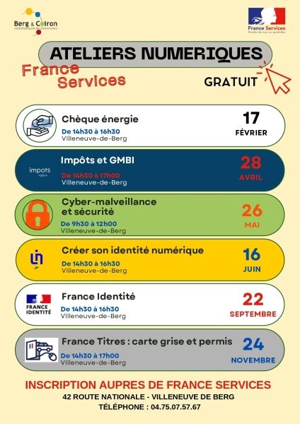 Ateliers gratuits, ouverts à tous Sur inscription auprès de France Services Villeneuve-de-Berg