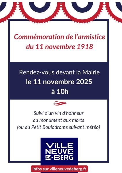 La commune de Villeneuve-de-Berg invite l’ensemble des habitants à participer à la cérémonie commémorative de l’Armistice du 11 novembre 1918, en hommage à tous les soldats morts pour la France.