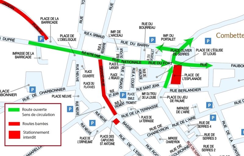 - En arrivant du nord par le D902 seule la rue du Barry (et les combettes) sera accessible. La descente vers la rue de Serres ne sera plus possible (sauf PL) une déviation sera mise en place par la rue du Barry -> Rue Toutes Aures -> Rue Neuve -> Rue de la terrasse.