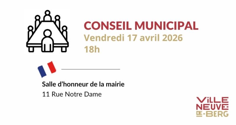 Le conseil municipal est prévu le vendredi 17 avril 2026 à 18h, à la salle d'honneur de la mairie de Villeneuve-de-Berg.